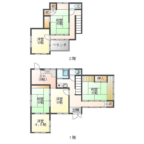 駐車場1台有(2台目庭造作により確保可能)、バス・トイレ(洋式)別、シャワー、キッチン、洗面化粧台、室内洗濯置場、収納、和室、フローリング、ベランダ、水道(公営)、ガス、木造(2階建)